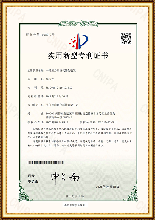 • 實用新型專利(一種壓力型空氣凈化裝置)